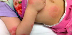 L'enfant a été mordu par un insecte. Il n'a pas vu qui l'a mordu. Il reste une tache rouge. Aidez-moi s'il vous plaît.