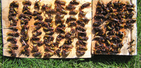 «D'une manière ou d'une autre, dans ma jeunesse, j'ai chassé les frelons du site et j'ai cherché leurs nids. Un processus intéressant, mais fastidieux. Trouver un frelon, l'attraper, le marquer, le traquer... Mais ça marche c'est sûr. Maintenant, je n'accroche que des pièges près de leurs preuves, mais immédiatement, depuis avril.Résultat : les frelons ne touchent jamais le rucher. Mais ils sont capturés régulièrement jusqu'à la fin de l'été, et en grand nombre.