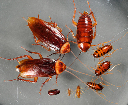 En regardant la photo, il est facile de déterminer que les larves et les adultes de la blatte américaine mènent le même mode d'existence dans une colonie commune.
